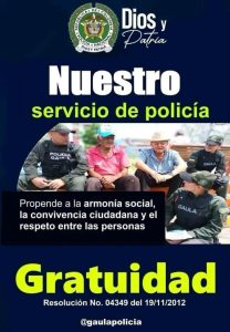 Igualmente reitera que los servicios que presta la Policía Nacional son gratuitos y propende por la armonía social, la convivencia ciudadana y el respeto entre las personas.